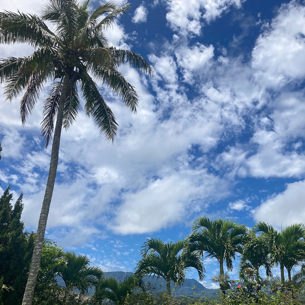 It's our last day in Hawaii. So we're heading-out, cloudy or not. The sun is up there, trying to break-through. All we need is a little finishing-touch to our tans—which, as usual, seem to crack, peel and fall-away during the long, dry flight home.