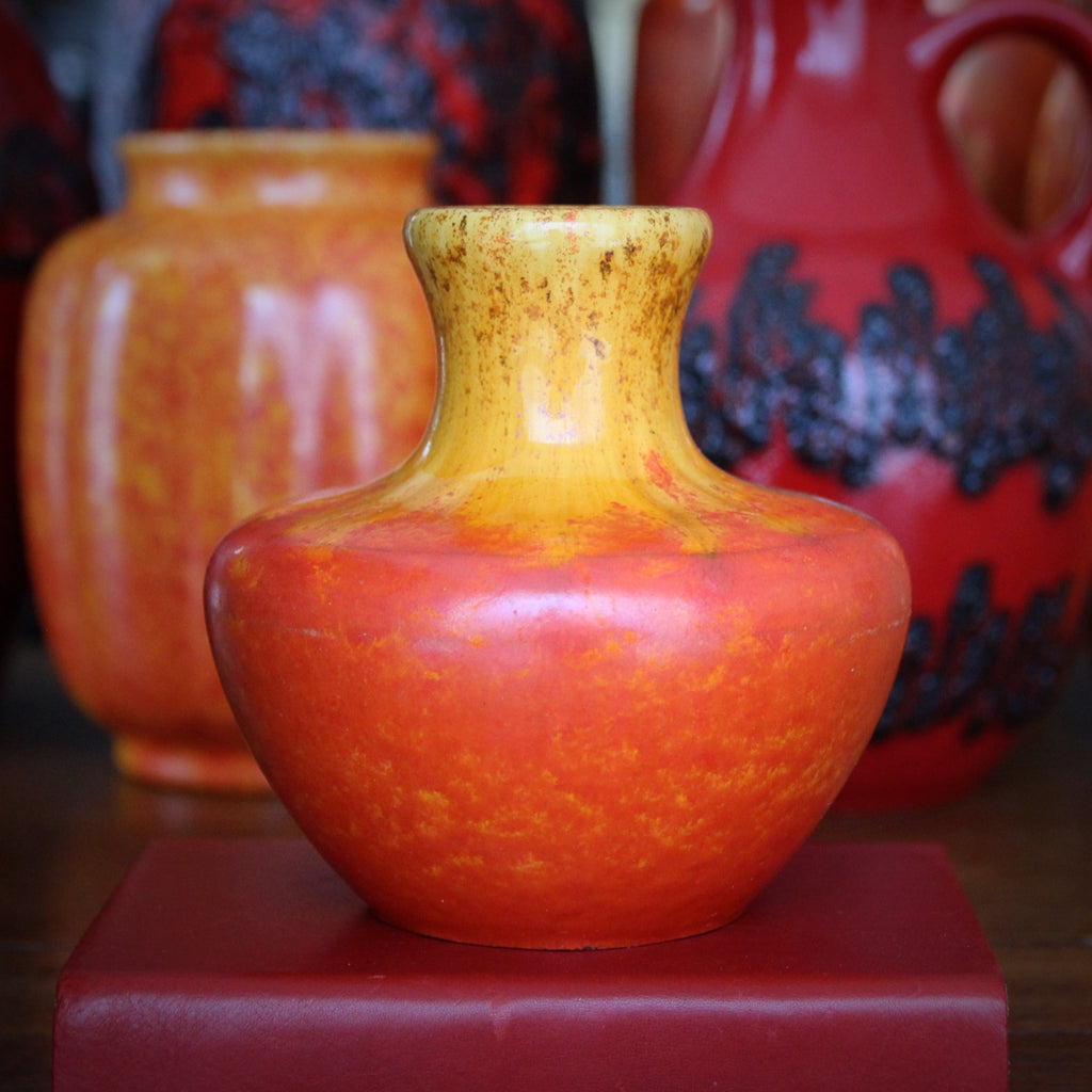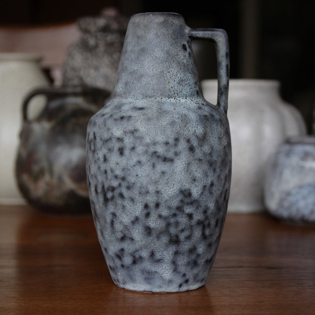 The German Modernist vase shown above, made in the Sixties or Seventies by Emons & Söhne, wears a dappled grey glaze over a chocolate brown under-color. It reminds me of the planet Mercury or some yet-to-be-discovered moon.