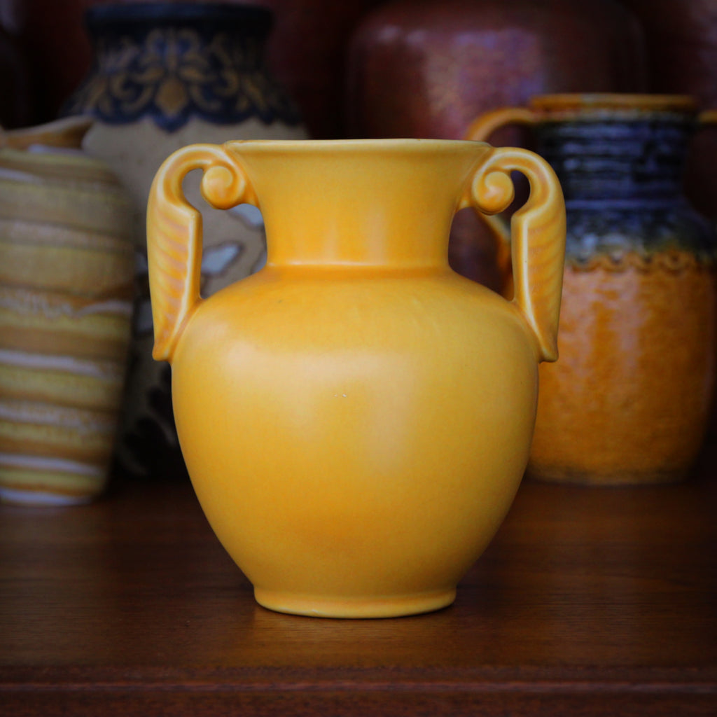 The Stangl Art Deco vase, shown above, is dressed in a saturated daffodil yellow glaze. The vase's form is inspired by a Classical Greek or Roman urn, embellished with a pair of foliate handles—which honor both the ancient aesthetic and the modernism of the Art Deco. And the rich yellow color practically vibrates with sunny optimism.