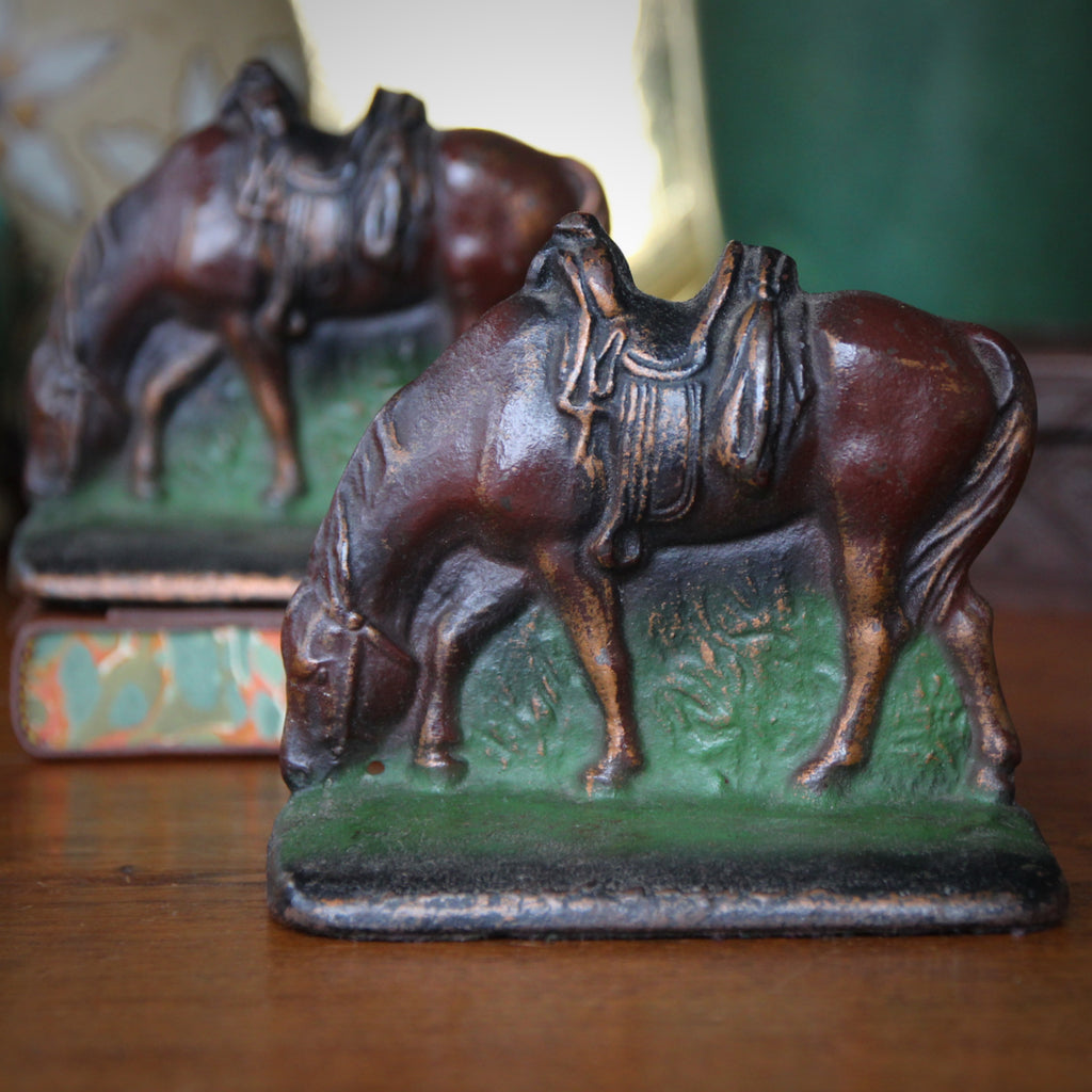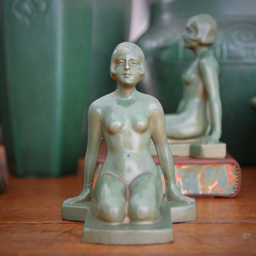 A pair of male nudes—young scholars—have fallen asleep, heads resting upon their still-open tomes. They are bronze-clad, in which a sculpted "composite plaster" figure is electroplated in bronze. This "bronze skin" can be finished—patinated, painted or both—as bronze would be. Such bronze-clad items had the appearance of bronze but were much less expensive to produce. Think of them as 1920's "poor men's bronzes," sold in gift shops or museum stores (where one might have just viewed the original work). This handsome pair of Art Nouveau bookends appear to straddle the transition where Art Deco design was just around the corner.