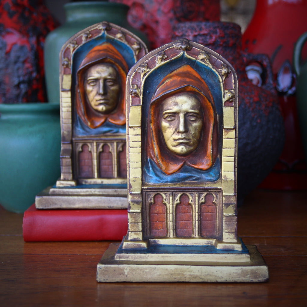 Hooded monks stare-out from these polychromed, bronze-clad Gothic Revival bookends made by J. B. Hirsch in the 1910's or 1920's. The company was founded in 1907, on the Lower East Side of Manhattan, by Joseph Hirsch, a Rumanian immigrant. He hired designers to sculpt the original models for bookends, like the pair above. To make bronze-clad bookends, first a model was sculpted. From the original model, moulds would be made in which plaster "composite" duplicates were cast. These plaster sculptures were then electroplated: hung in a vat of water mixed with bronze powder and zapped with an electrical current, during which the bronze powder formed a solid bronze "skin" around the plaster form. Once the bronze skin was attached, the object...