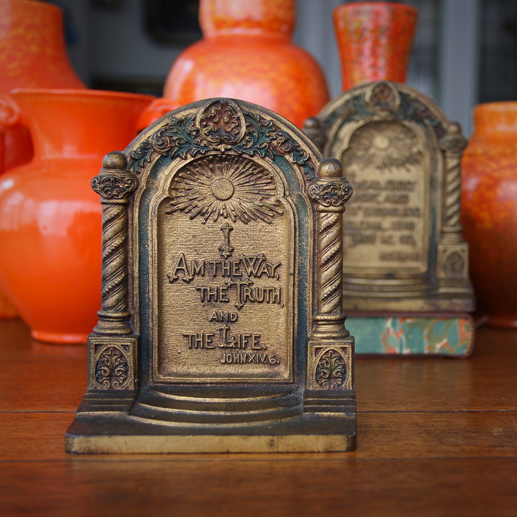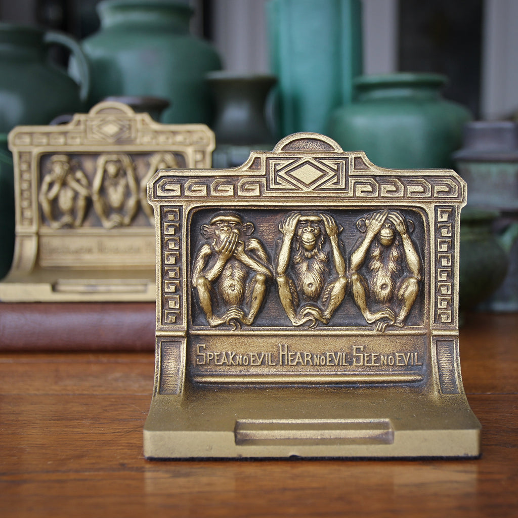 Three charming monkeys remind us to "mind our P's and Q's." Nicely modeled bas relief primates pose within an architectural proscenium arch. These cast iron bookends were made by Bradley & Hubbard in the Twenties or Thirties. They still have their original golden finish.