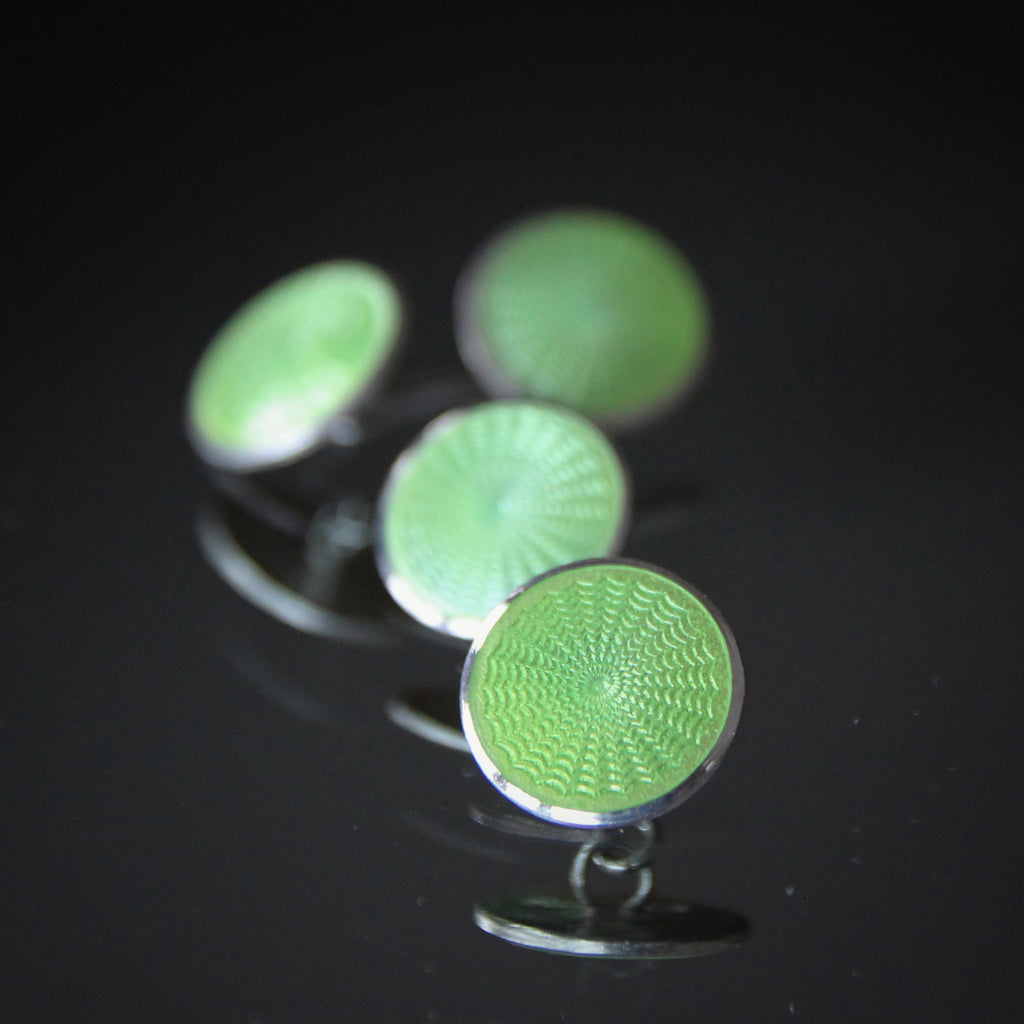 Shown above, a pair of sterling silver Art Deco cufflinks with soft celadon green enameling. Swirls of machine-turned guilloché provide subtle, radiant energy.