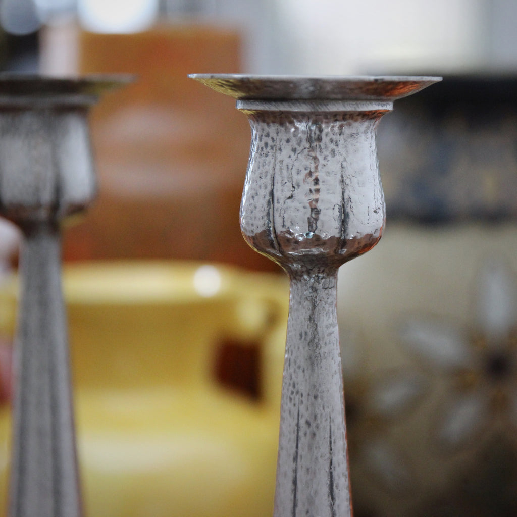 Like the candlesticks we shared earlier this week, this elegant pair of American Arts & Crafts candlesticks have a botanical inspiration. The "cups" resemble tulip buds, just ready to open. The shafts reflect tapered, tightly-bundled tulip stems. And the "bobeches" are cut into a scalloped, petal-form shape. The entire candlestick is hand-hammered and silver-plated. They were made in Meriden, Connecticut around 1910.