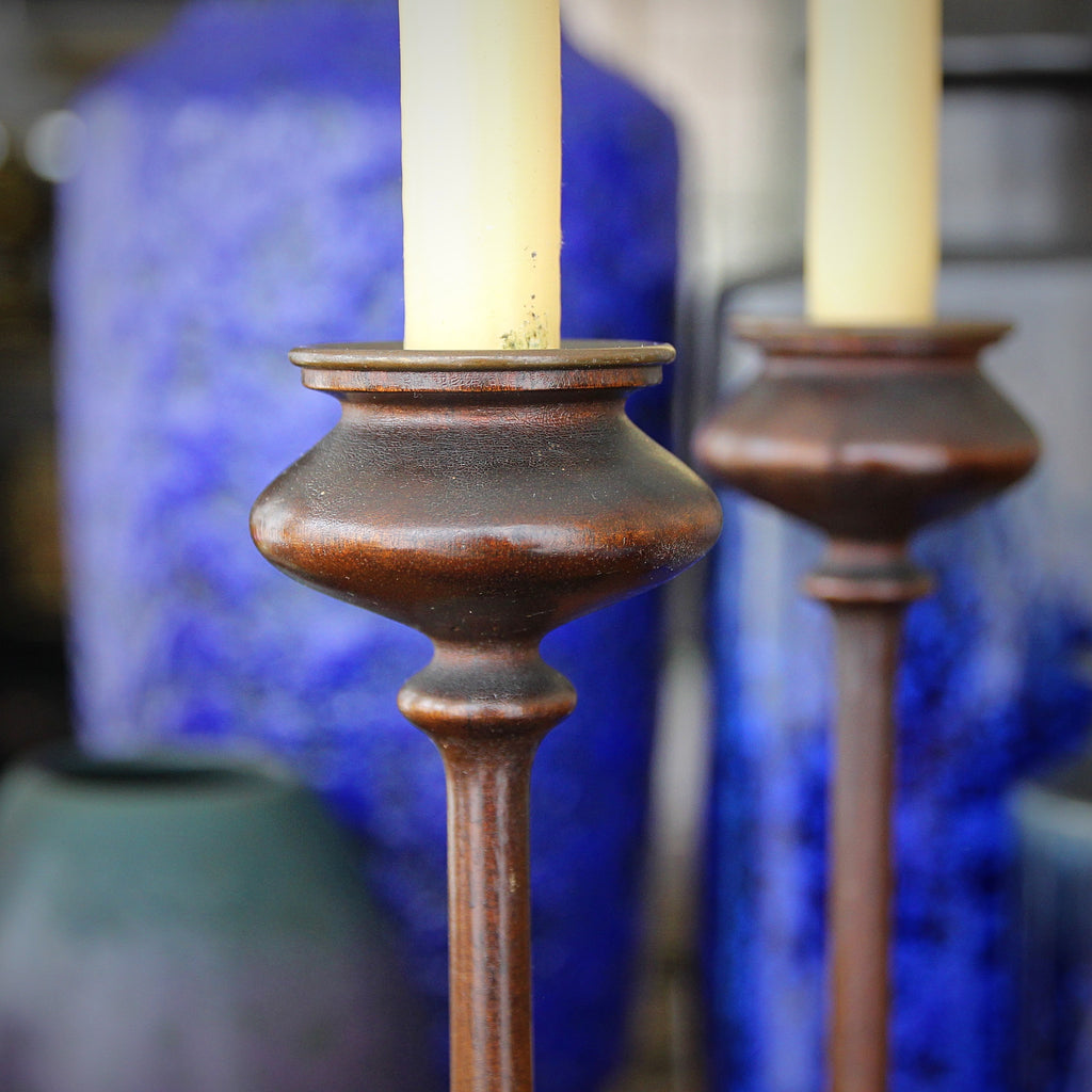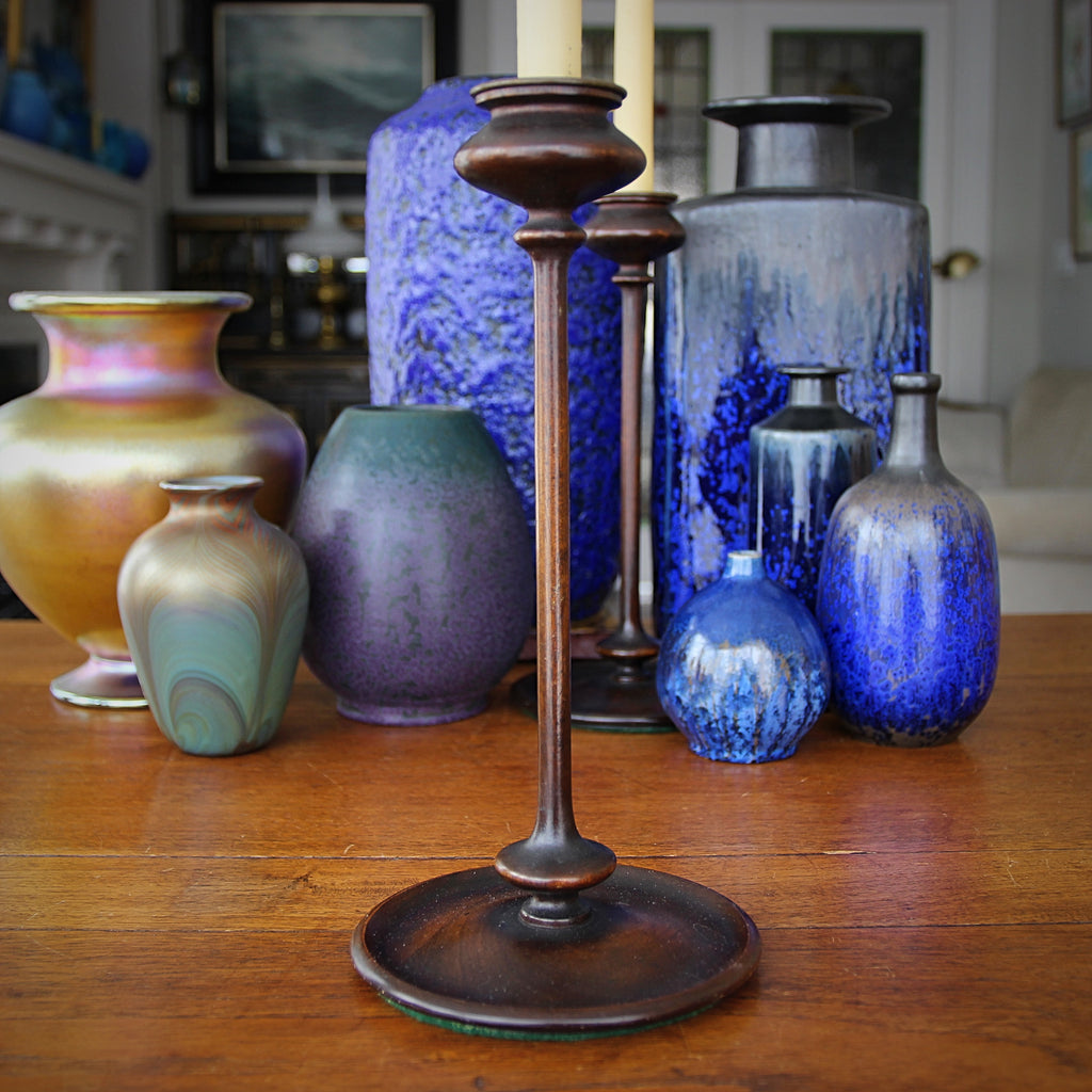 One of my favorite finds of the last few months: a pair of English Arts & Crafts turned mahogany candlesticks. The "cup" at the top has a tulip blossom or poppy pod floral-form. And "knuckles" at the top and bottom of the reed-thin shaft give visual weight to the turning. Truly elegant! And much more impressive in-person.