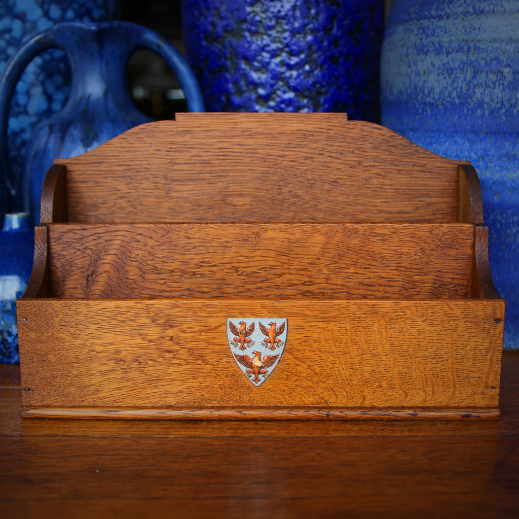 Can one have too much organization on one's desk? This English early Twentieth Century oak stationary stand bears the crest of Queen's College, Oxford. Store stationery supplies: envelopes, paper, business cards. Perhaps a stash of commonly used forms or cards. Or keep your to-do cards and paperwork close-at-hand. And the handsome, wooden construction adds a small touch of architectural interest to your office, den, kitchen or entryway.