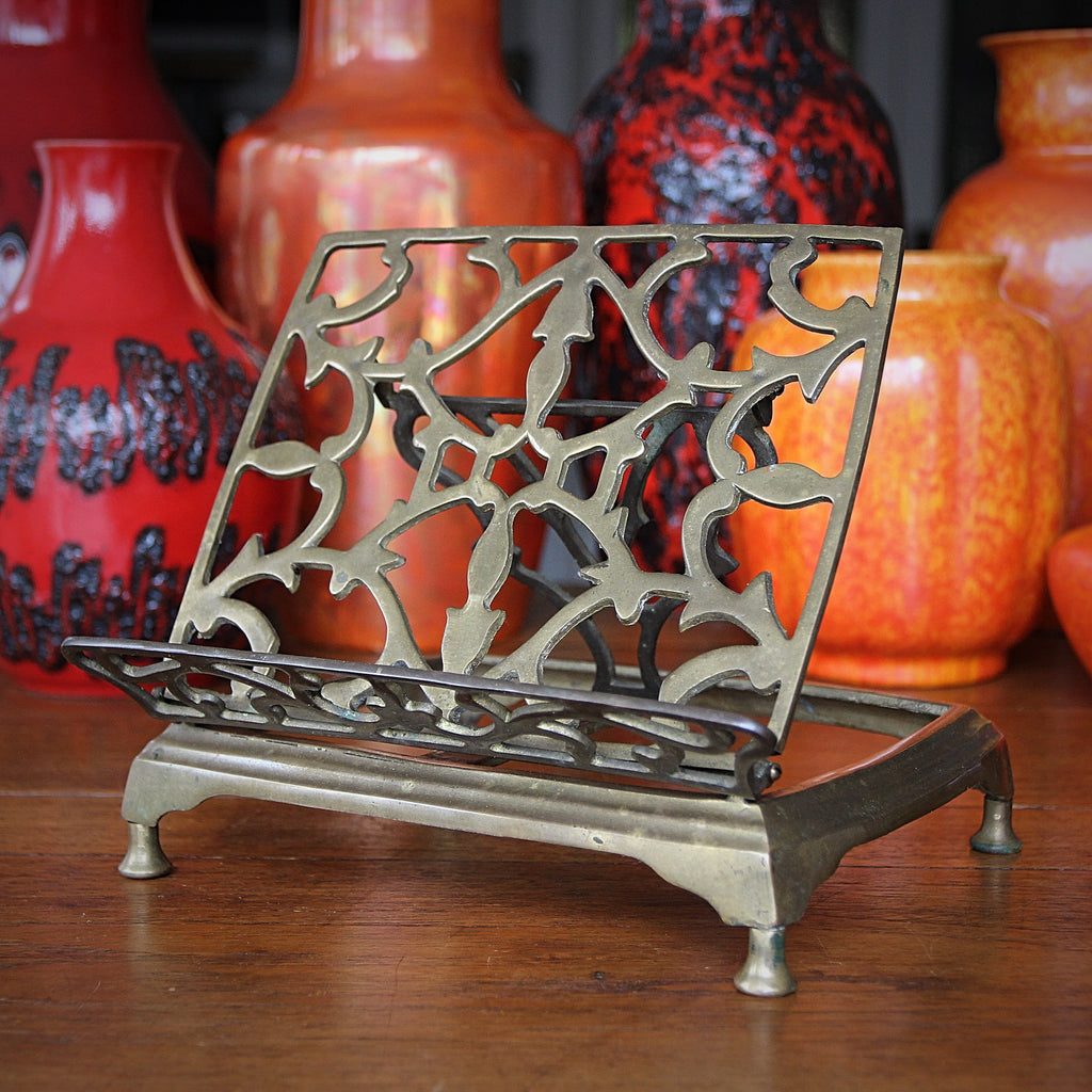 Despite the wisdom of the Carpenters, neither rainy days nor Mondays "really get me down." Not when I have such a handsome English Arts & Crafts "stick stand." A variety of woodworking techniques—piercing, turning, chamfering, crenelation—create a most handsome and useful piece. And the brass drip bowl is well-darkened with years of hard-earned patination.