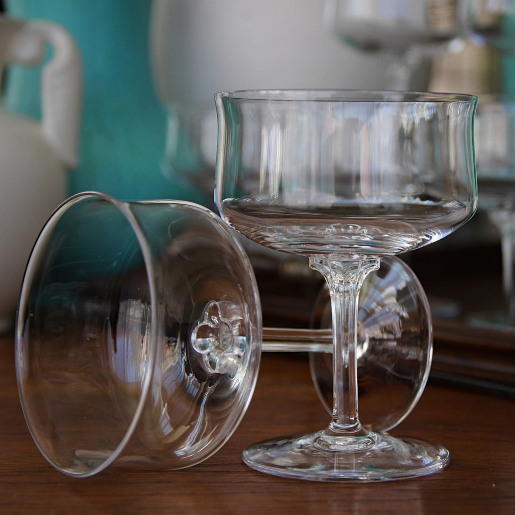 Here's a nice set of eight (plus one) fine crystal cocktail or champagne glasses, made in the Forties or Fifties. The glasses have a sensuous "tulip-form" bowl and a faceted stem for an easy grip and nice handfeel. A lovely "ring" sings-out the glass's fine quality.