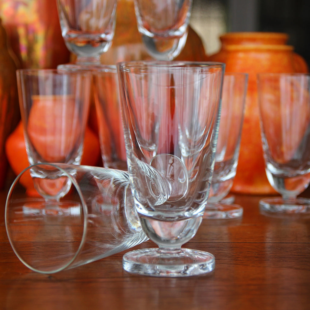 These Eighties Modernist slab-footed glasses are not very old, more vintage than antique, but they are good quality crystal and have a nice handfeel. The gently-curved vessels sit atop a chunky, foot.