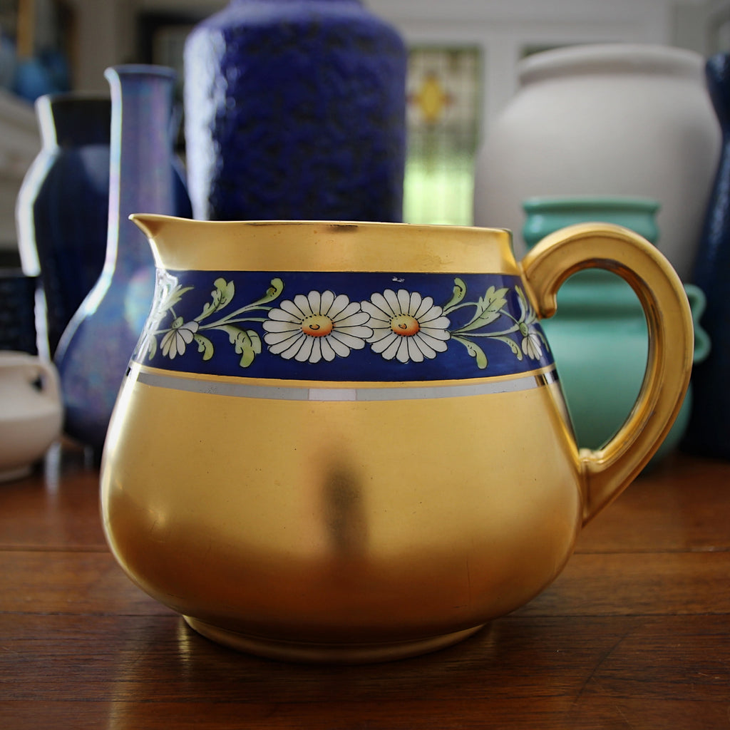 I cannot help but think of the Sun when I look at this cheery, Bavarian Jugendstil porcelain vase. A handsome Art Nouveau floral pattern peeks through the gilt glazing. It was made by Graf & Krippner in Bavarian Selb—in Germany, along the Czech border. Having been created so close to the Austro-Hungarian border helps explain the "Viennese aesthetic attitude" of the vase. The mark indicates it was made in the company's earliest years, 1906 to 1911. Selb is famous for its porcelain manufacture and is the headquarters of the Rosenthal manufactory. While the piece can be used to hold a stem or two, this vase is perfect for standing as punctuation within a collection of gold ceramics or glassware.